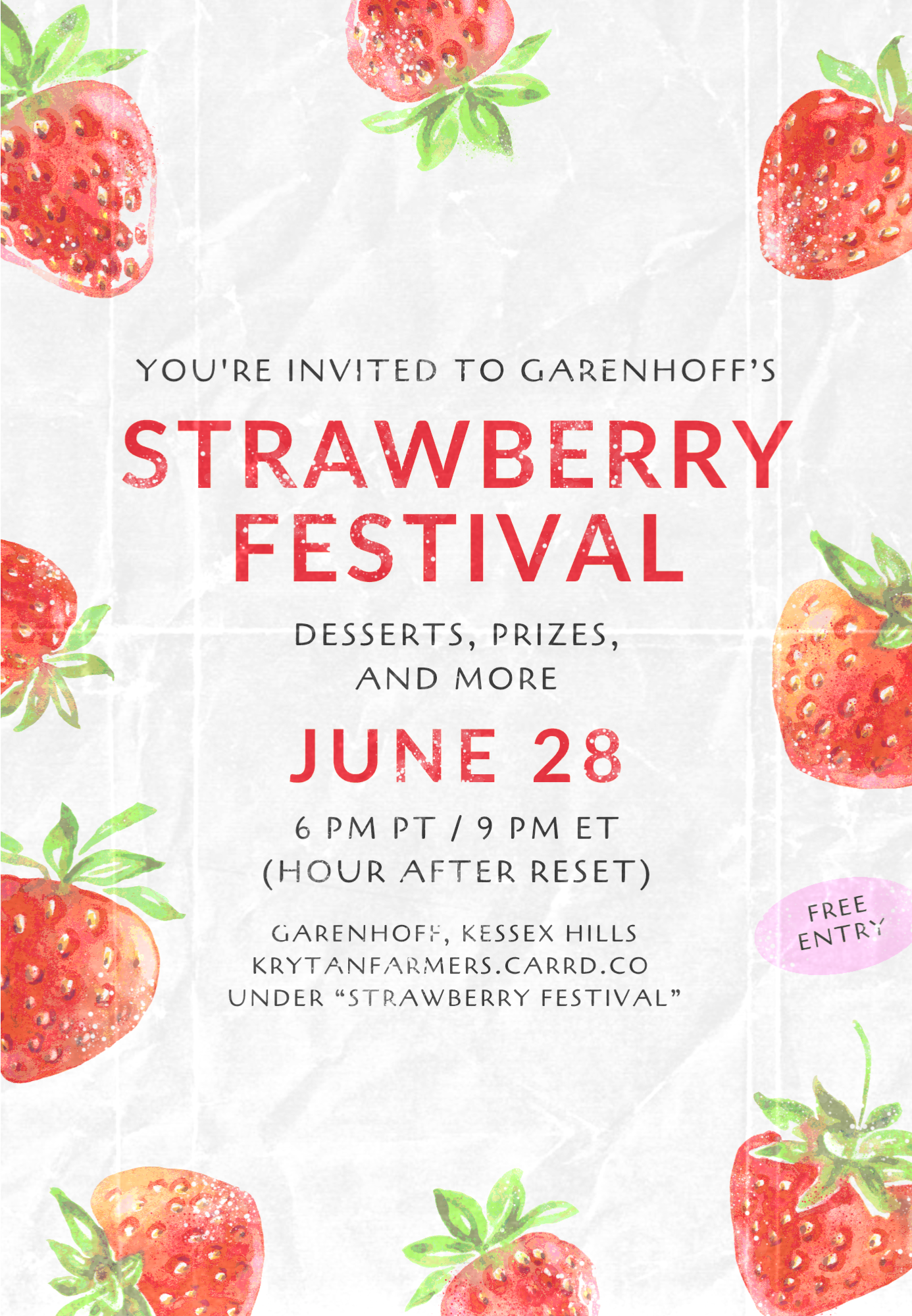 Content/Theme: Food / Faire / Celebratory / Commerce / ContestGarenhoff is hosting its annual festival celebrating its local fruit - strawberries! Not only will we have vendors offering all sorts of strawberry themed goodies - we'll also be having an annual contest of seeing who will be dubbed our "Strawberry Sage" to help bless the town with a plentiful harvest this season.Contact @ciijay on Discord if you would like to: